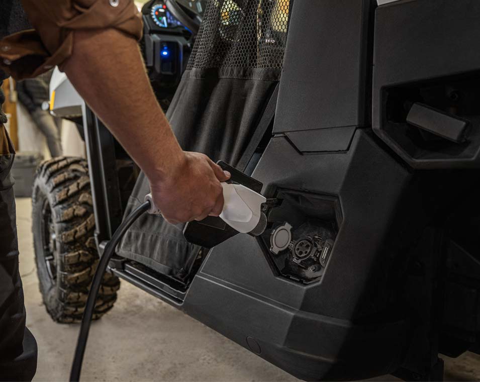 - Pantalla táctil de 7 "(accionable con guantes) con sistema infoentretenimiento EV (incluye autonomía restante, estado de carga de la batería, estado de carga, indicador de lanzamiento, diagnóstico del sistema y más), limitación de velocidad, modo pala, sistema de navegacion GPS con sistema Ride Command, temperatura del aire, Bluetooth, radio AM / FM, Cuadro con dos indicadores analógicos, con centro de información para el conductor con pantalla LCD multicolor de 4": con informacion de, uso de energía y regeneración %, estado de carga de la batería %, autonomía restante, evaluacion de carga, temperatura de la batería, temperatura del motor, voltaje de los accesorios, velocímetro, odómetro, cuentakilómetros, indicador de marcha, indicador de servicio y códigos, intervalos de servicio programables, recordatorio del cinturón de seguridad, iluminación de fondo y brillo seleccionables por el usuario, Asientos premium con respaldos contorneados y logo Polaris bordado, volante premium y detalles interiores, sistema eléctrico Polaris Pulse (6 posiciones) para accesorios, toma de corrientee DC, puerto USB doble, caja de carga con puerto SAE de 12 V con interruptor de encendido / apagado en el tablero, altavoces integrados, cámara trasera, *conectividad con la +App Ride Command